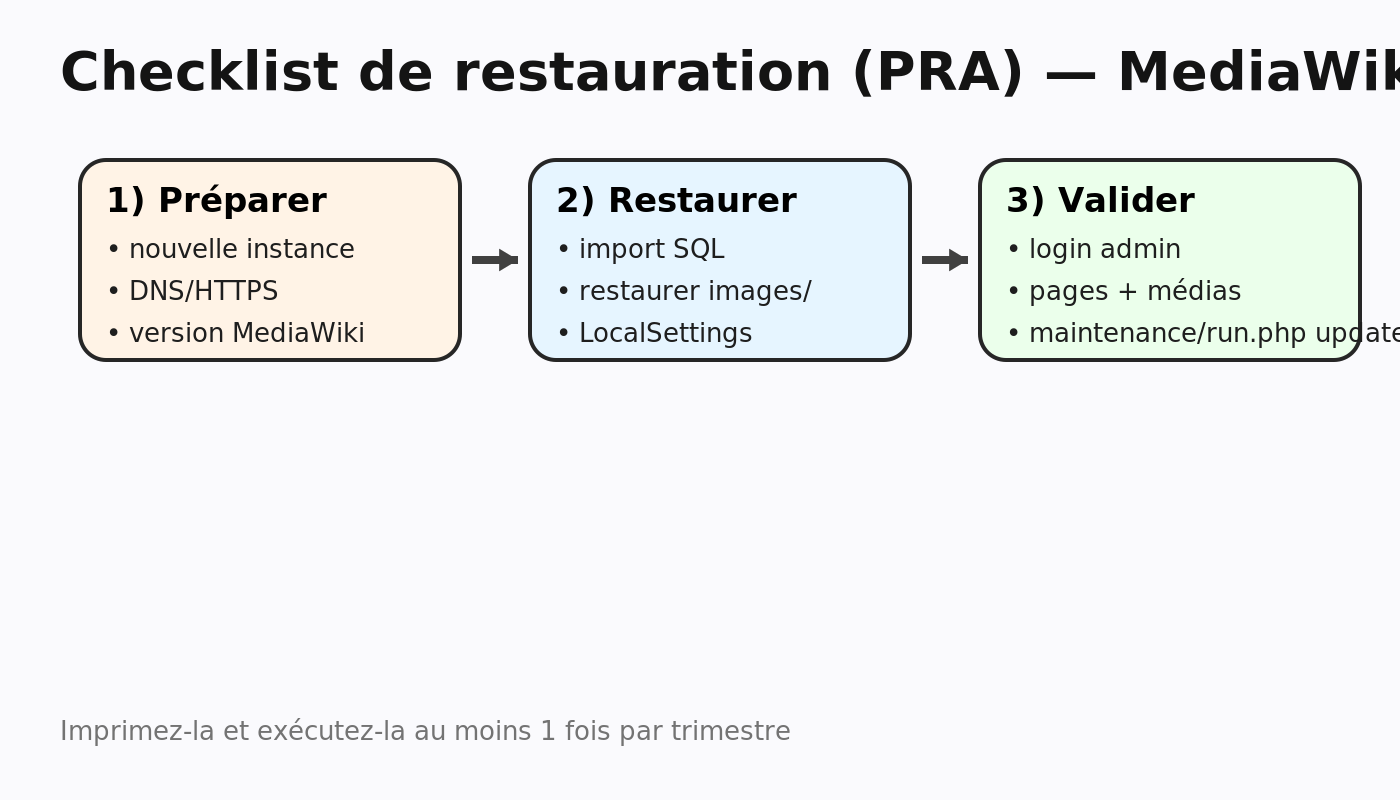 Quand un wiki tombe (erreur humaine, disque plein, mise à jour ratée), ce n’est pas le moment d’improviser. Une sauvegarde MediaWiki utile, c’est une sauvegarde restaurable, testée et répétable.