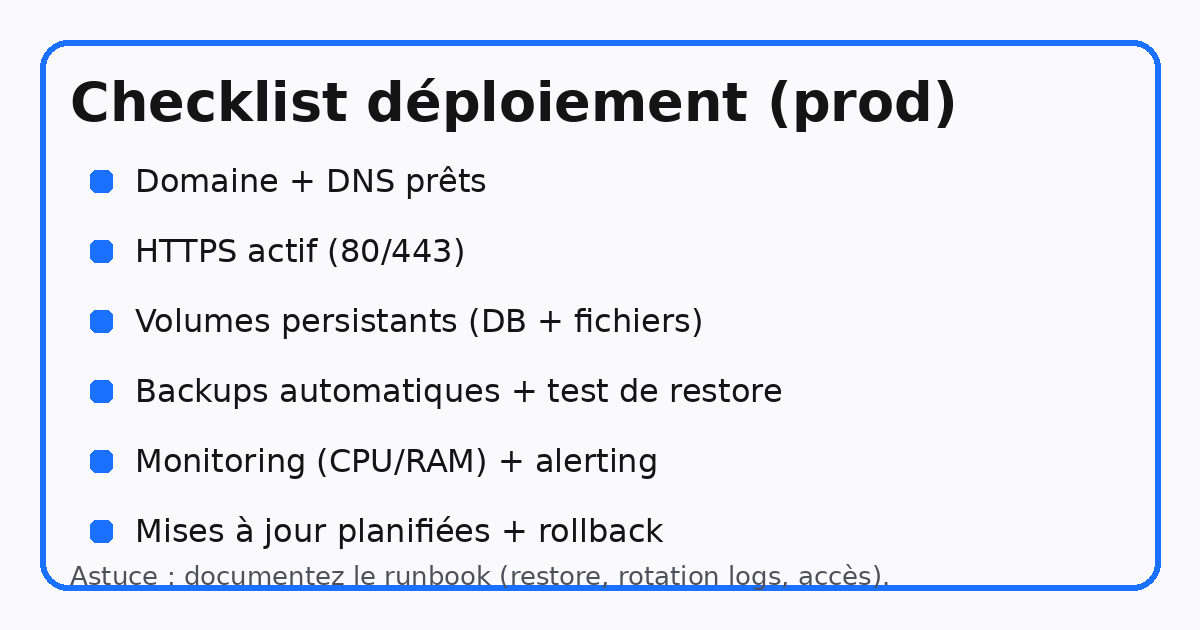 Astuce : documentez noir sur blanc “où sont les données” et “comment on restaure” — c’est ce qui fait la différence le jour où il y a un incident.